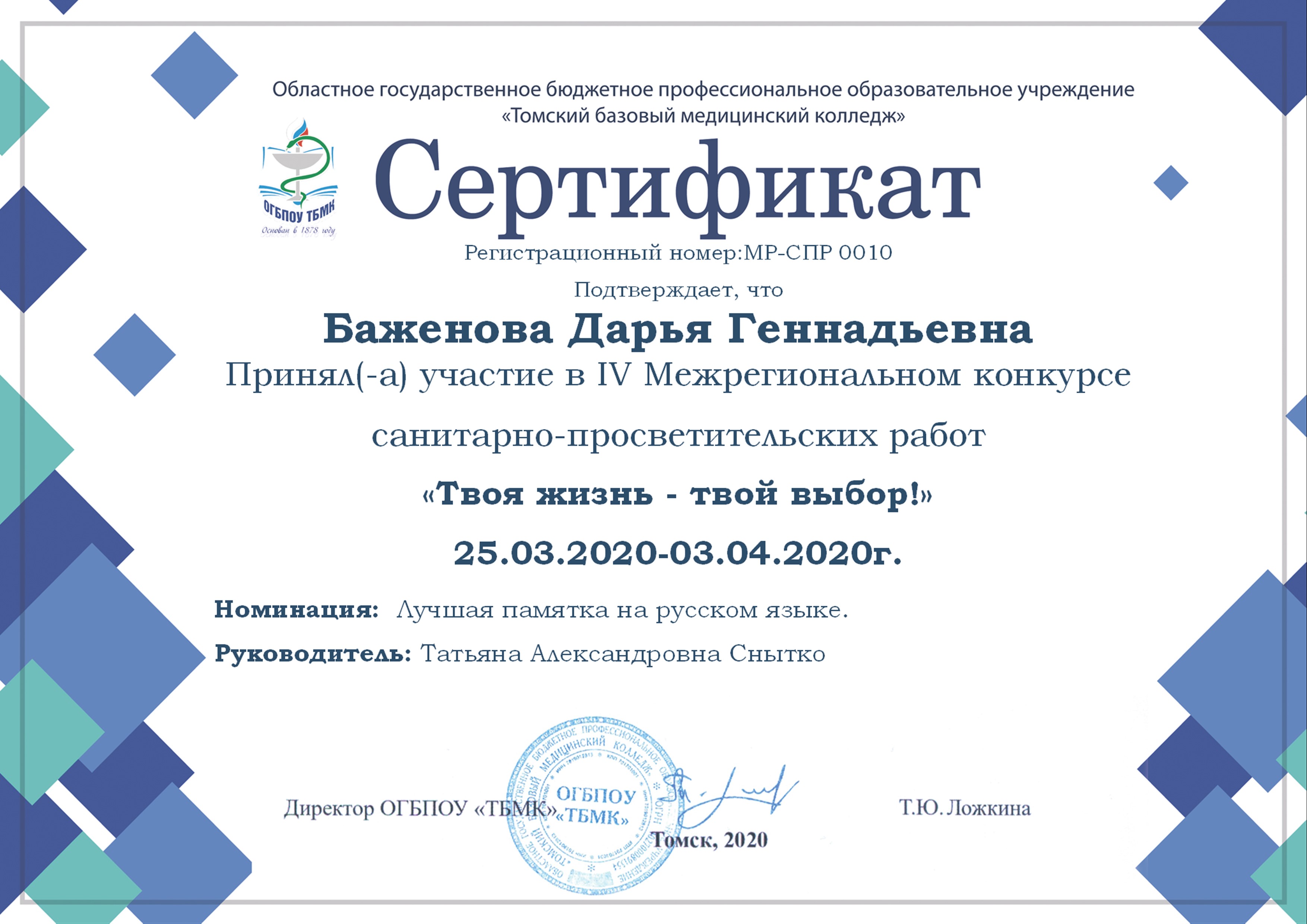 IV Межрегиональный студенческий конкурс санитарно-просветительских работ «Твоя жизнь – твой выбор!» проведен на базе ОГБПОУ «Томский базовый медицинский колледж» совместно с ОГБУЗ «Центр медицинской профилактики». Конкурс проводился с целью содействия развитию профессиональных компетенций обучающихся в области ведения санитарно-просветительской работы с населением и приобретения обучающимися социального опыта в решении профессиональных задач. В Конкурсе участвовали студенты 3 курса: Фохт Элеонора, Карасева Анастасия, Баженова Дарья, руководитель Снытко Татьяна Александровна. Все работы отмечены Сертификатами.