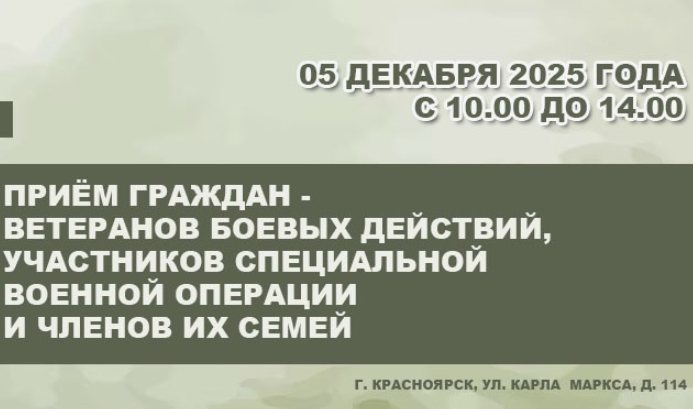 Личный приём пройдет 05 декабря 2025 года с 10.00 до 14.00 в помещении КГАУК Государственная универсальная научная библиотека Красноярского края по адресу: г. Красноярск, ул. Карла Маркса, д. 114.